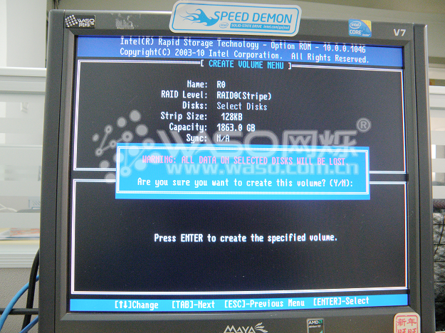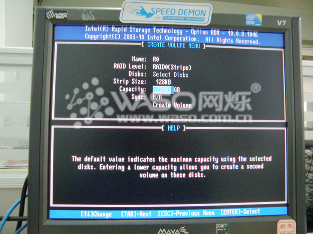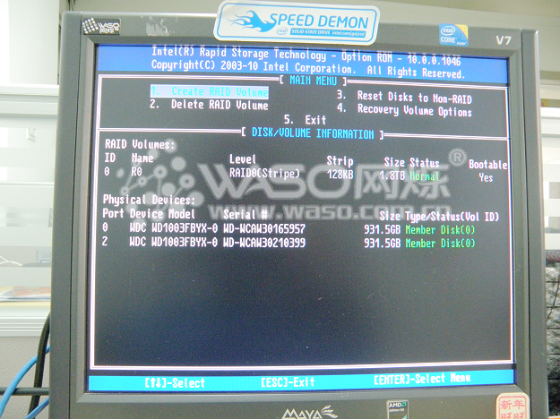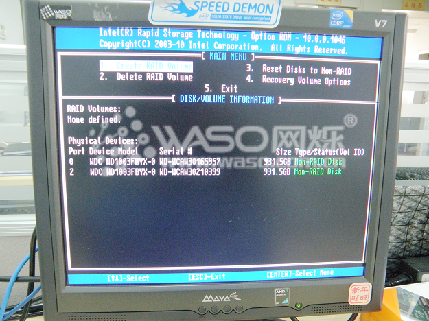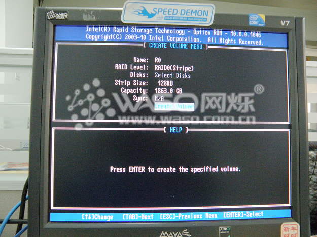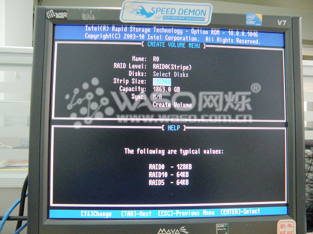 接下来,我们主要介绍一下如何创建阵列和如何删除阵列,也就是对应的1项和2项。1、Create RAID Volume 2、Delete RAID Volume ;首先来看如何创建阵列:以两个西数1TB RE4企业级做RAID 0为例子,首先我们选到第1项 "1、Create RAID Volume",然后回车。"Name"为阵列的名字,我们取名为"R0";回车来到下一行,"RAID Level"为RAID的模式,我们上下键选择到"RAID0"继续回车;来到"Disks",选择硬盘,我们现在只有两个1T企业级,就直接选中两个硬盘,回车;"Strip Size"默认为128KB,继续回车,来到"Create Volume",回车以后系统提示你是否确定创建阵列,这个时候点"Y"确定,阵列就创建好了。