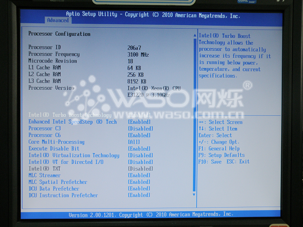 Processor Configuration:在这个选项里面,我们可以看到CPU的一些具体参数,还有一些CPU特殊性能设置,比如"Intel Turbo Boost"睿频加速技术、HT超线程技术等等,都可以在这个选项里面进行开启和关闭。