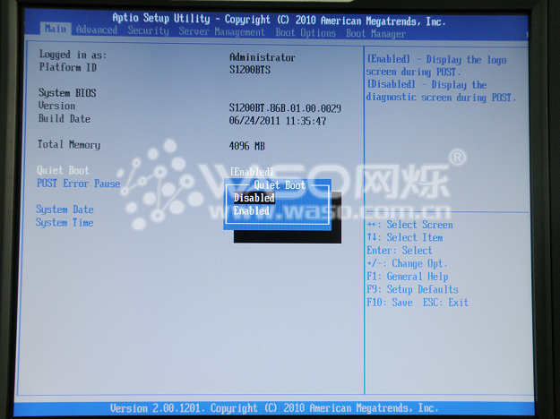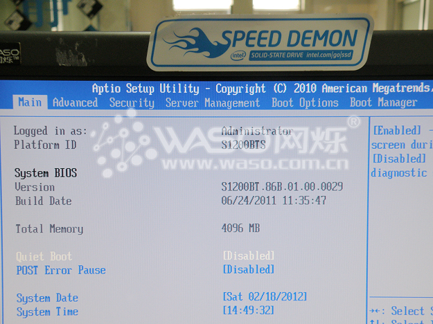 进入BIOS以后,首先映入眼帘的就是这张图片,主板BIOS一共有八个大项,分别为1:Main 2:Advanced 3:Security 4:Server Management 5:Boot Options 6:Boot Manager 7:Error Manager 8:Save&Exit;我们首先来看第一个大项,Main;这里面有一个比较重要的选项就是"Quiet Boot”,主板默认值是开启的,选项为Enabled;这个时候,开机点亮以后会出现一个Intel巨大的LOGO,这个时候我们就需要按"ESC"来把这个界面跳过,不然的话,这个界面会一直占据显示器界面直到服务器自检完成到系统启动项那里。所以,一般情况,我们会把"Quiet Boot”这个选项调为Disabled;当机器点亮以后,每一样自检都可以在界面里显示出来,这样也方便于我们在后面进行阵列的搭建设置或者做一些其他设置。