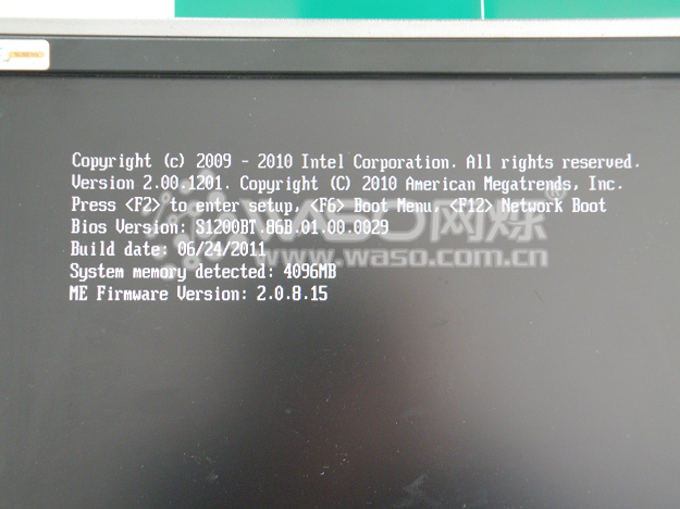 接下来,我们以intel S1200BTS为平台,搭载一颗XEON E3-1220的至强CPU,一根金士顿4G ECC DDR3 1333内存,两个西数1TB 企业级 RE4硬盘,额定500W电源。搭好平台以后,通电,开机,大概等待5秒以后点亮机器,系统会提示按"F2"进入BIOS设置。