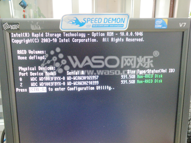 我们按"F10"保存退出以后,重新点亮机器,我们就会看到如下的界面提示,系统提示我们按"CTRL+I"进入串口阵列设置界面。