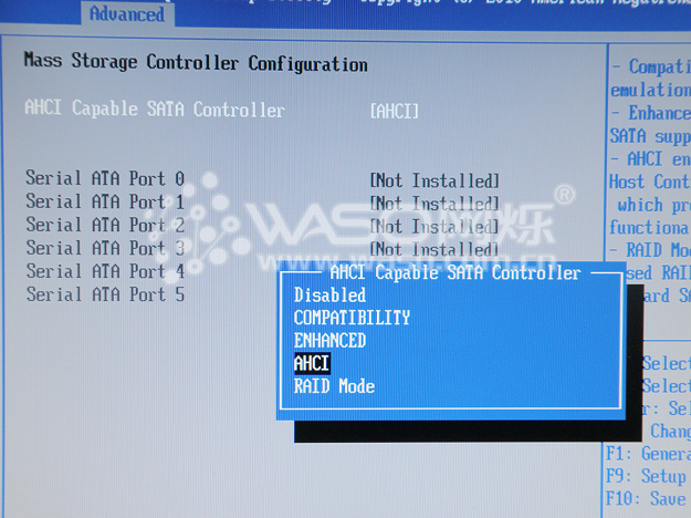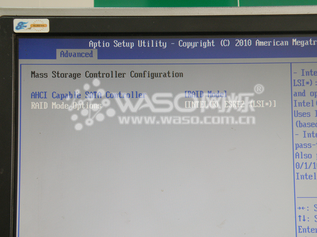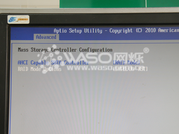 Mass Storage Controller Configuration:板载的存储控制器,这个是需要我们详细来介绍一下的,板载串口阵列的打开和关闭也是在这个大项里面。默认的"SATA Mode"为:"AHCI",如果我们是接的一个硬盘,一般情况下面,我们会把"SATA Mode"改为:"ENHANCED",装系统的时候不需要加载驱动,这个时候板载阵列是关闭的。如果我们需要做阵列,则需要把"SATA Mode"选项调为"RAID Mode",这个时候板载串口阵列就是打开的了。而默认的"RAID Mode"是:"INTEL(R) ESRT2 LSI(*),一般情况下面,我们会把"RAID Mode"调为:INTEL(R) RST,调为这个选项,方便做RAID 的GHOST,做系统也比较方便。但是有一点需要特别注意,不管你是用的单盘还是做的阵列,如果恢复了系统的默认值,在重新启动的时候一定要注意修改SATA Mode,不然如果做好了系统重启恢复了BIOS默认值,进系统的时候会出现蓝屏死机的情况。
