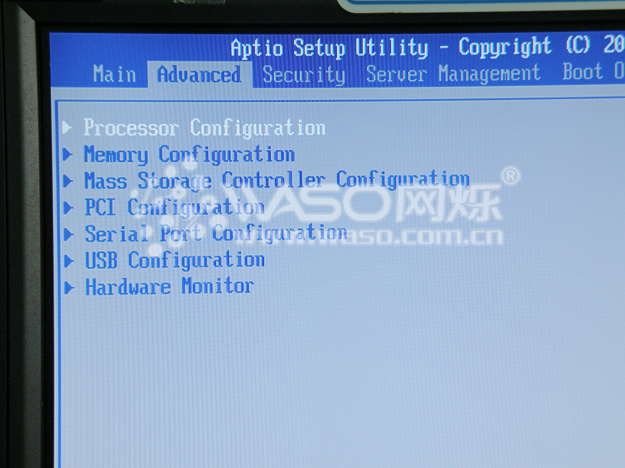 接下来,进入第二个大项,"Advanced",我们主要来看一下这个选项里面的前三项,"Processor Configuration" "Memory Configration" "Mass Storage Controller Configuration" 分别为处理器,内存和板载存储的一些参数设置。