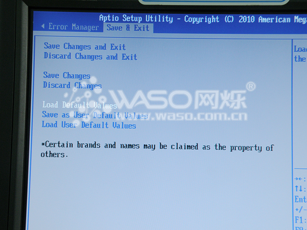 BIOS第八个也是最后一个选项是退出选项,这里有一个比较重要的子选项就是:"Load Default Values",恢复BIOS出厂默认值,当你的BIOS设置不小心调乱了,你就可以通过这个选项来恢复默认值。不过恢复了默认值也要注意,就是在开始的篇幅里面说到的"SATA Mode",一定要调到正确的那个选项。