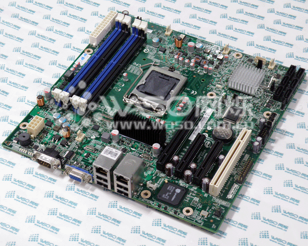 首先,Intel S1200BTS是一款intel C202芯片组的入门级单路服务器主板,支持现在E3系列的至强CPU和普通桌面i3 G系列 LGA 1555的CPU;主板板载了4根内存插槽,单根最大支持4G,支持的内存规格为ECC三代;主板板载6个SATA接口,支持RAID 0,1,5,10;板载两个千兆网卡,一个是Intel 82574L 千兆网卡芯片,1个为Intel 82579LM 千兆网卡芯片;主板尺寸为9.6“×9.6";大致参数就是这样,图片如下图所示: