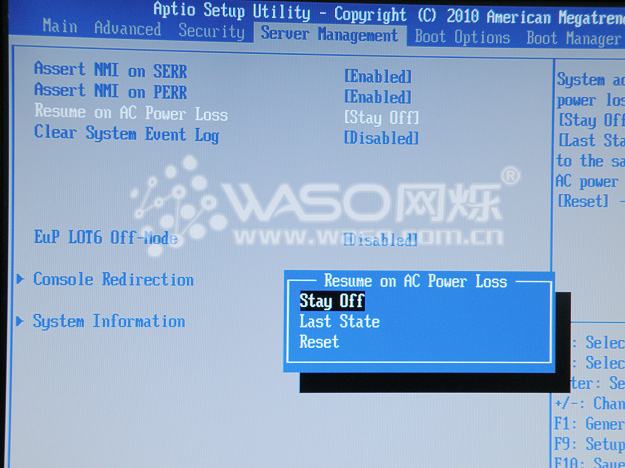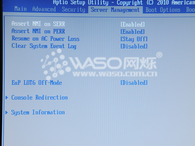 BIOS第四个大项是一些服务管理设置,"Server Management",有一个选项是很多客户都问到过的,"Resume on AC Power Loss",就是电源缺失管理,比如服务器因为某种原因断电了,你想在电源通电以后自动开机,那么"Resume on AC Power Loss"这个选项就要调为"Reset";接下来还可以看到系统信息"System Information"的一些信息。